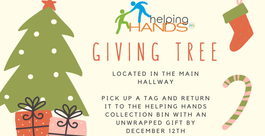 The Helping Hands Giving Tree is up in the main hallway. Please take a tag and bring back an UNWRAPPED gift by Sunday December 12th. Helping Hands will be distributing them on December 15th to those less fortunate families in our community. Thank you for helping us make the holidays a little brighter.